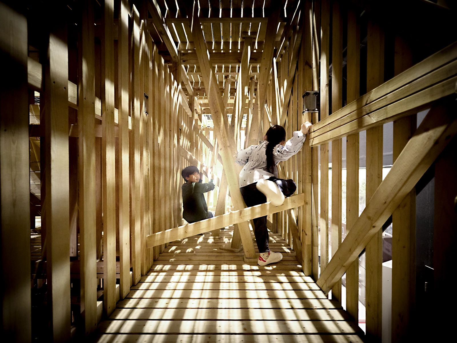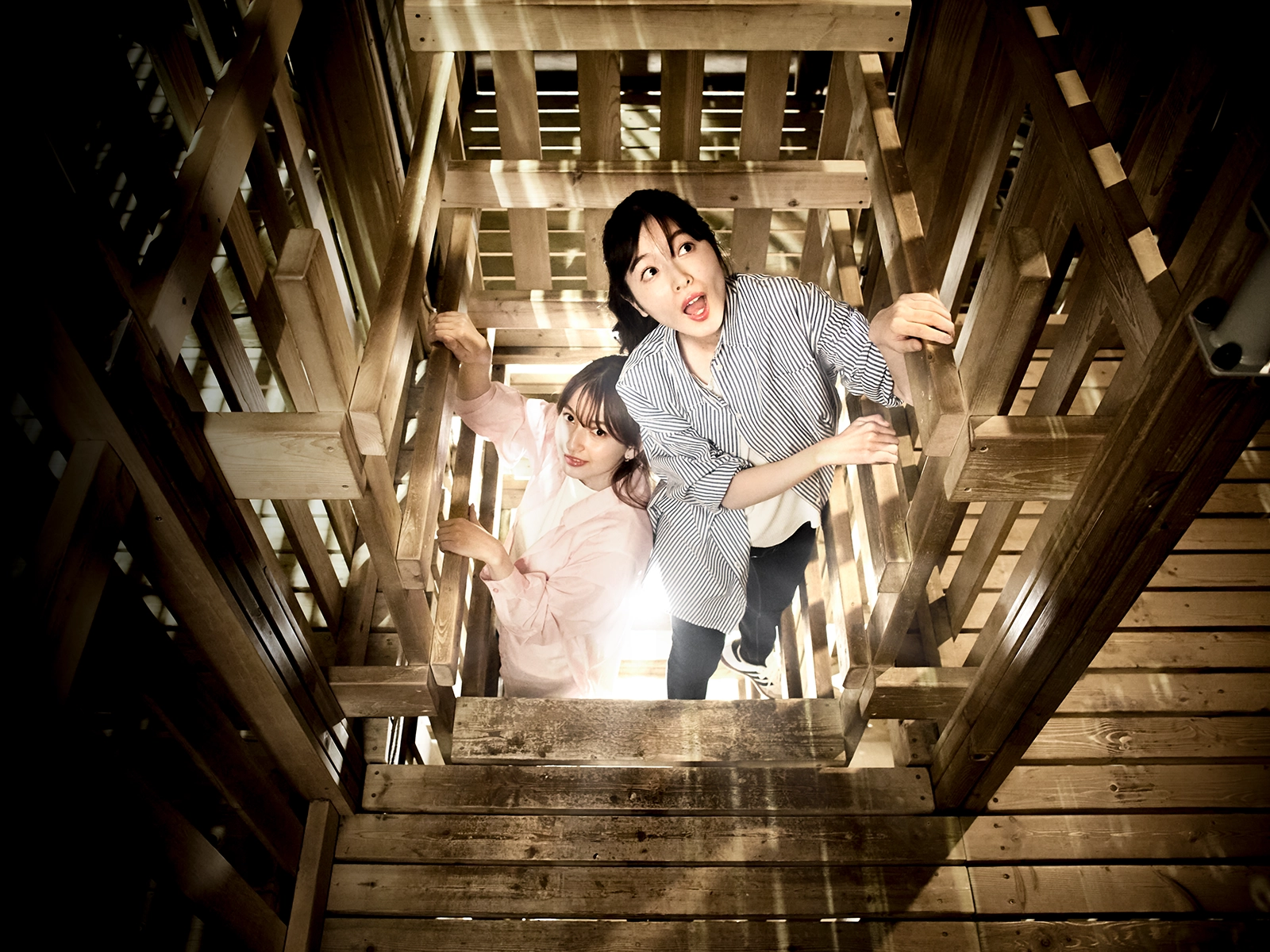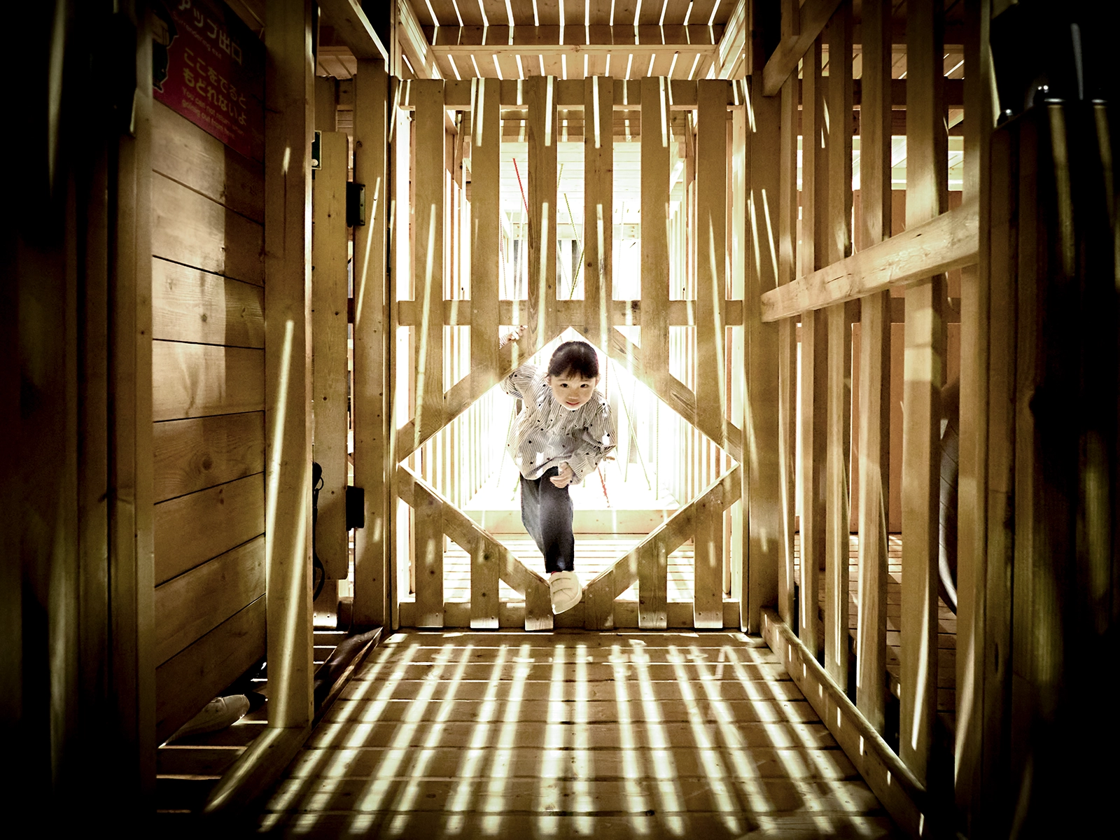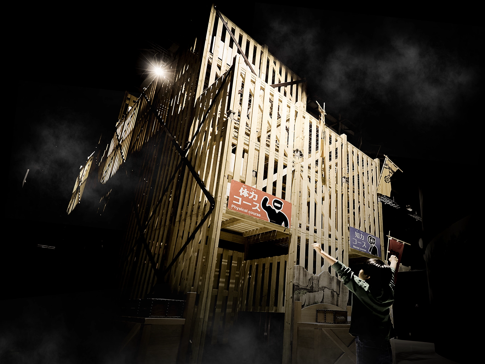 3階建て、高さ10mの屋内型高層立体迷路には、"ロープ迷路"や"井桁登り"など、さまざまな忍者の罠が仕掛けられている。コースは体力コースと知力コースの2つ。立体的な木組みの中で、ギミックやアスレチックをくぐり抜け、最上階のゴールを目指せ。