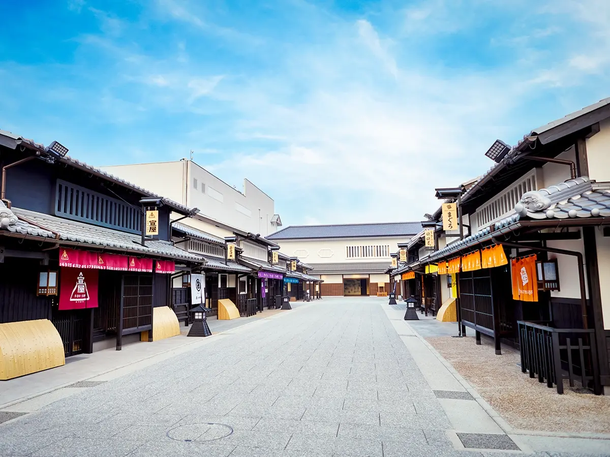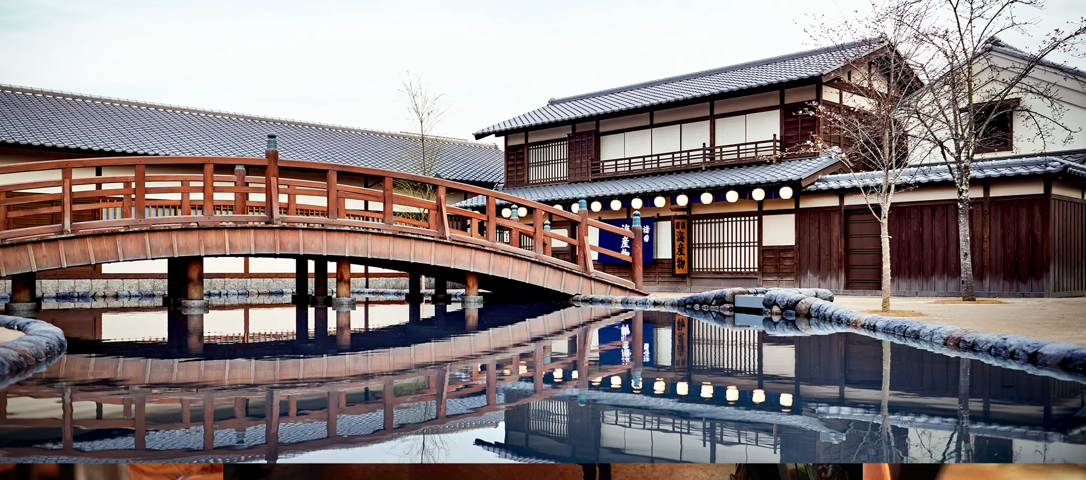 湯屋をはじめとした、江戸の建物が立ち並ぶ風情ある一角。前方に架かる橋と相まって、夜にはさらに情緒深い景観が楽しめる。