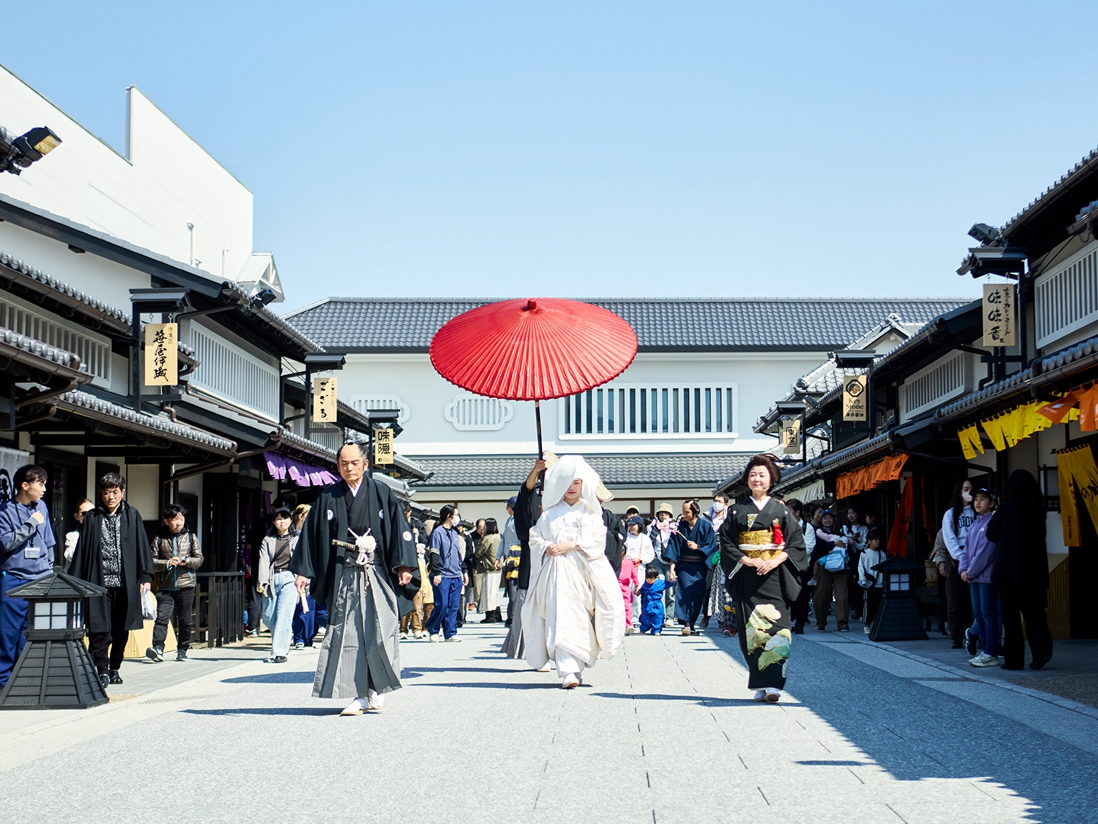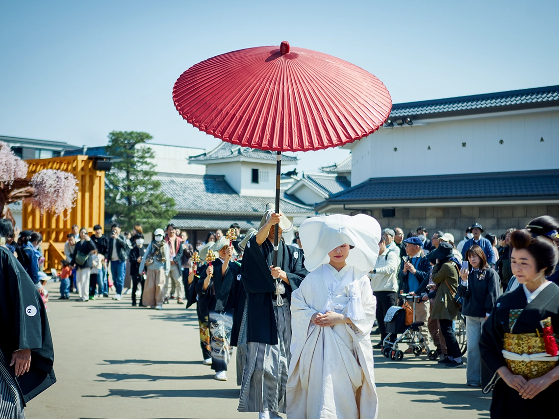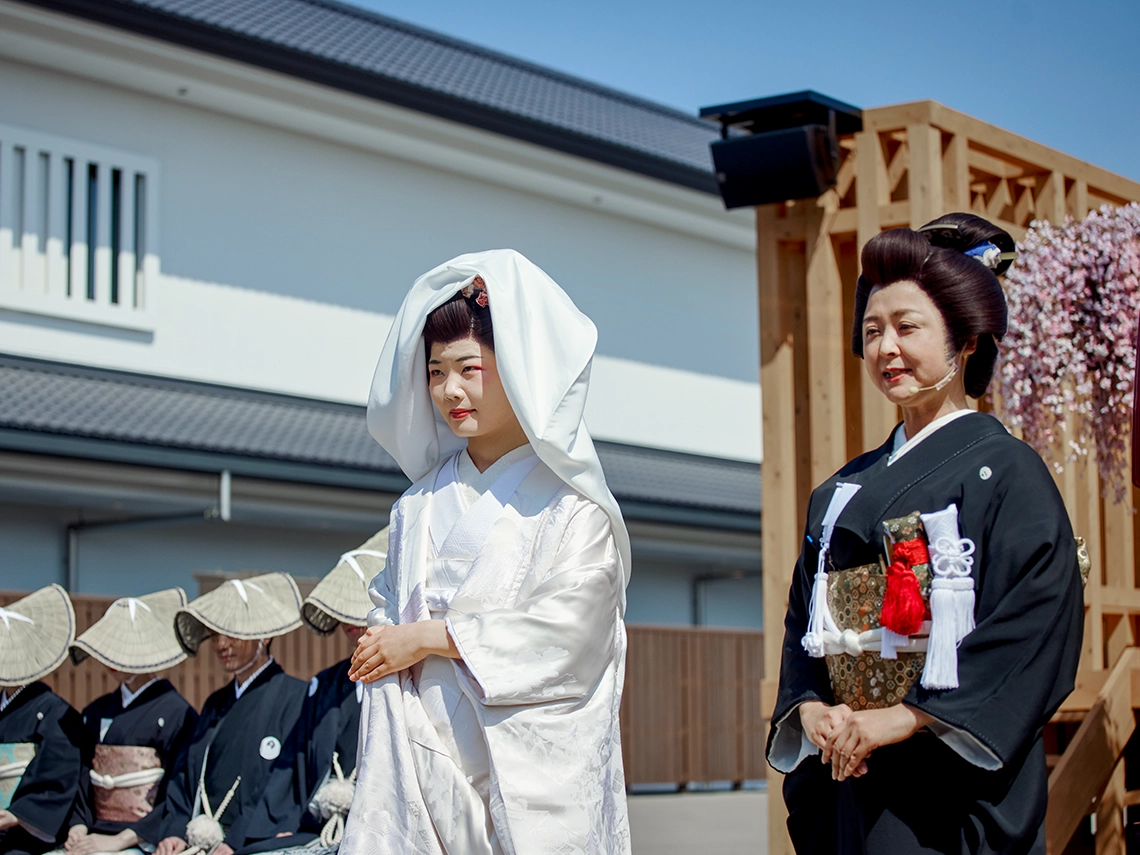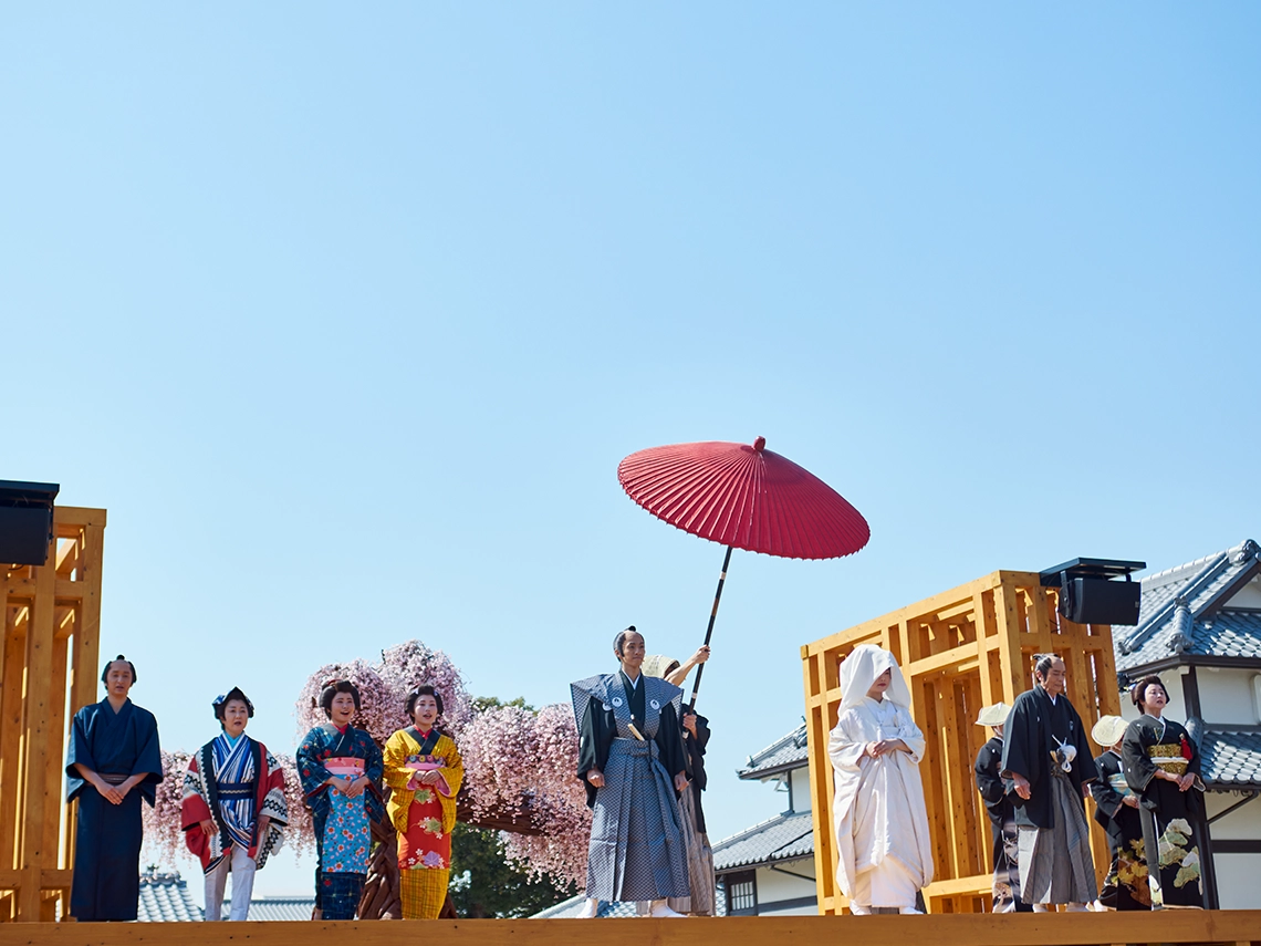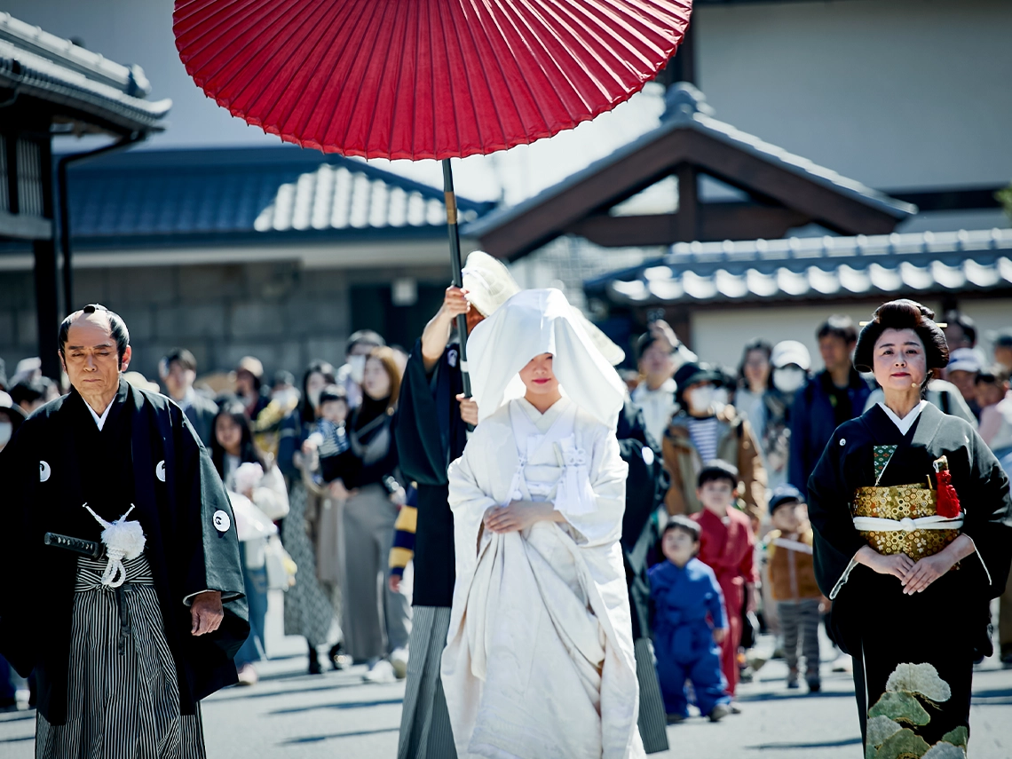 第一期リニューアルを迎えた太秦映画村が取り組む、新しく刺激的なコンテンツ。そのコンテンツを通して私たち日本人が古来より大切に育んできた「祝言」への“想い”や“こころ”にも、ぜひ想いを馳せていただけましたら幸いに存じます。古くは祝言の席で謡曲『高砂』が謡われ、夫婦和合や長寿円満が寿がれてきました。ともに時を重ね、支え合う姿への願いは、今なお私たちの心に息づいています。ご来場いただく皆様に、この「花嫁道中」を通して日本人の精神文化や家族・人と人との結びつきの尊さをあらためて感じていただければ嬉しく存じます。