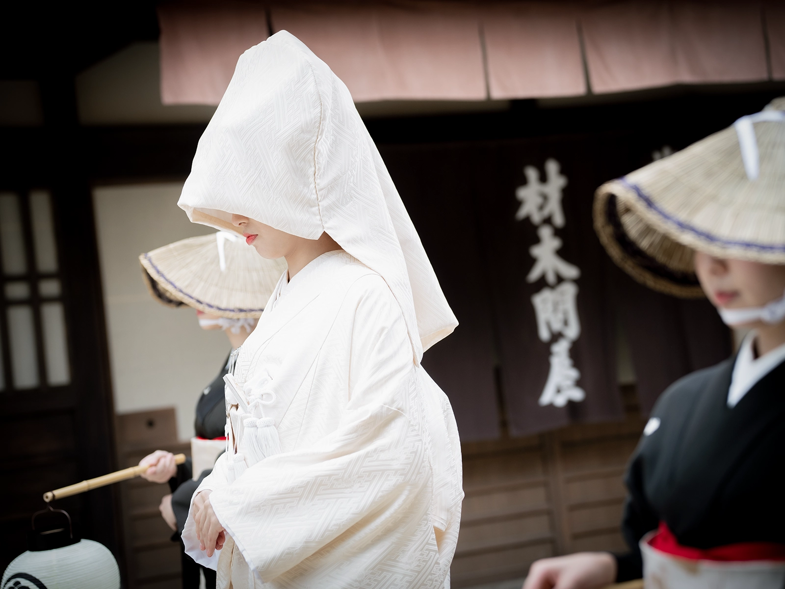 花嫁道中と聞くと、華やかな行列をイメージされる方が多いでしょう。その反面、花嫁にとっては永遠の別れを意味し、婚家に嫁ぐと言う命をかけた人生最大のイベントでもあるのです。 本編では、見た目の優美さを愛でると同時に、是非花嫁やご両親の「覚悟」を感じながら見て頂きたいです。